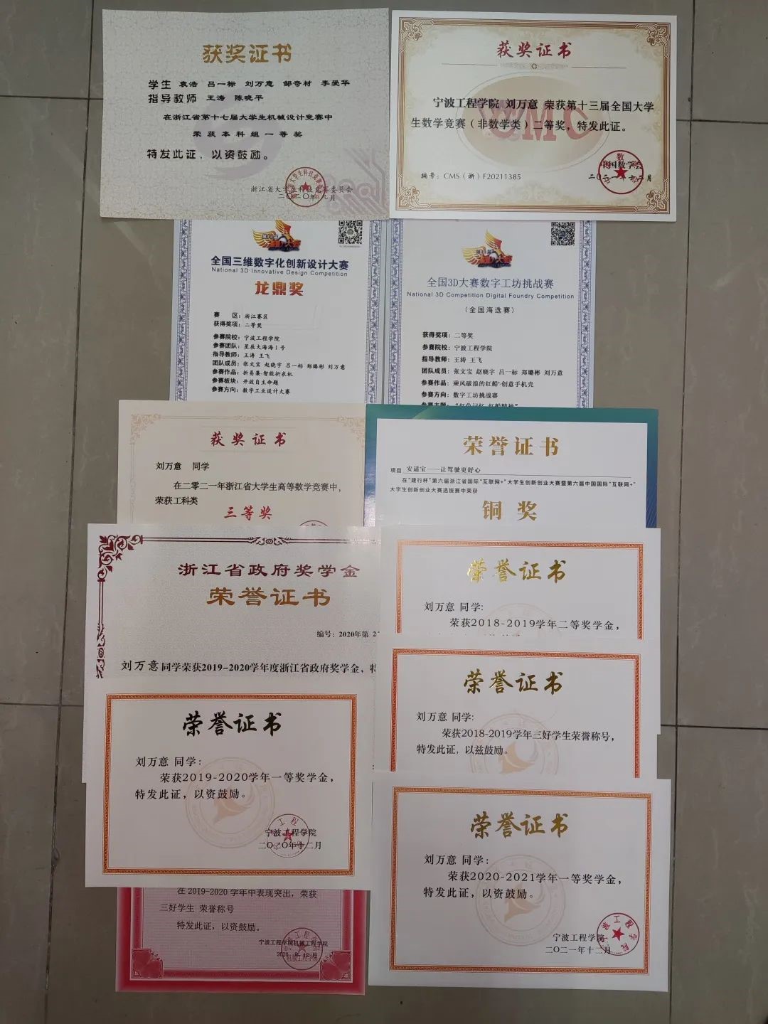 曾获两次浙江省政府奖学金,两次校一等奖学金,一次校二等奖学金,全国老员工数学竞赛二等奖;浙江省第十七届老员工机械设计竞赛省一等奖;浙江省第六届互联网+创新创业比赛省铜奖;全国 3D大赛数字工坊挑战赛二等奖 ;浙江省老员工数学竞赛三等奖;全国三维数字化创新设计大赛二等奖;目前已授权一项发明专利,另有七项发明专利处于发明公开阶段,其中一项为第一发明人。