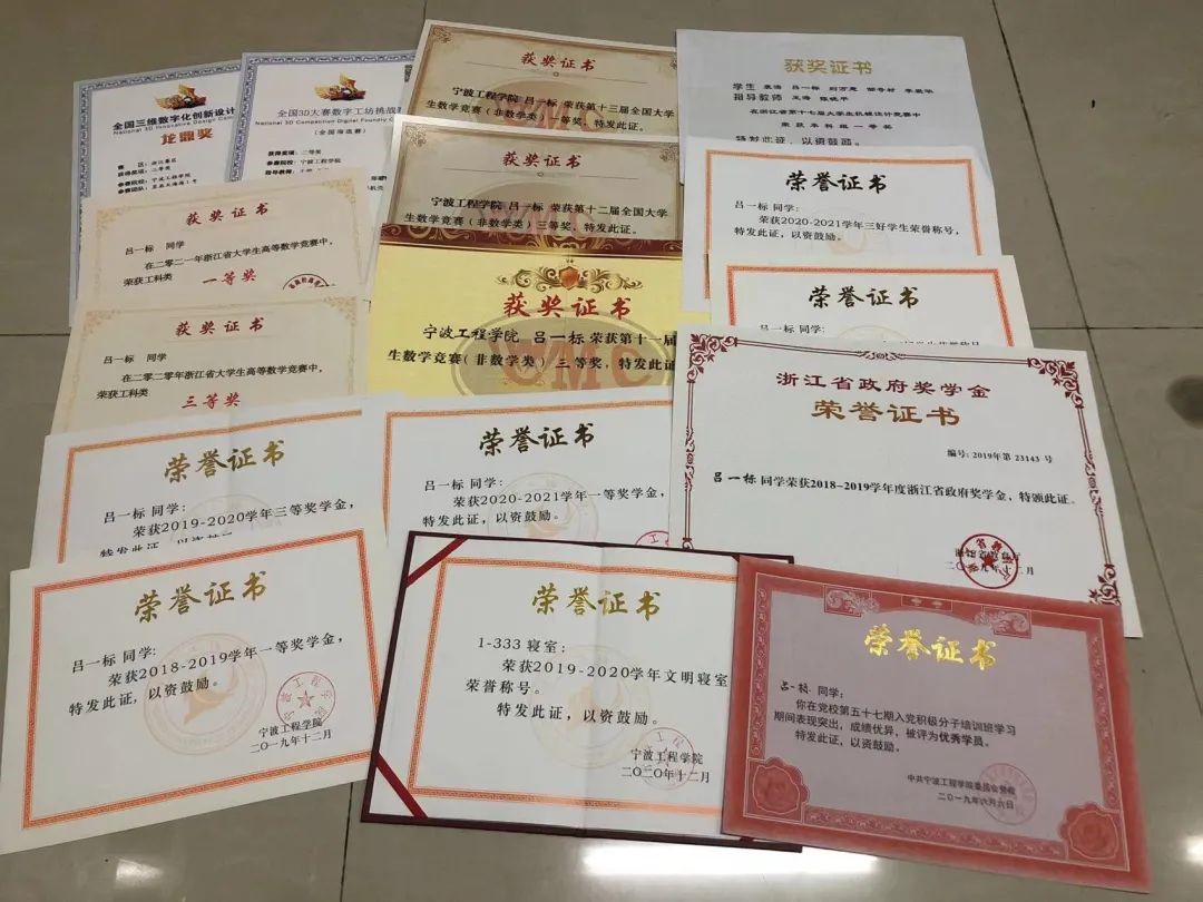曾获两次省政府奖学金;两次校一等奖学金;校三等奖学金;两次校三好员工;省级优秀毕业生;五十七期党校结业优秀学员;2019-2020文明寝室成员;2018军训优秀内务寝室成员;优秀义务兵(部队);十佳退伍老兵(部队);浙江省第十七届老员工机械设计竞赛一等奖;第十三届全国老员工数学竞赛一等奖;2021年浙江省数学竞赛一等奖;全国3D大赛数字工坊挑战赛二等奖;全国三维数字化创新设计大赛二等奖;2020浙江省数字竞赛三等奖;第十一届全国老员工数学竞赛三等奖;第十二届全国老员工数学竞赛三等奖;2019互联网创新大赛“优胜奖”。