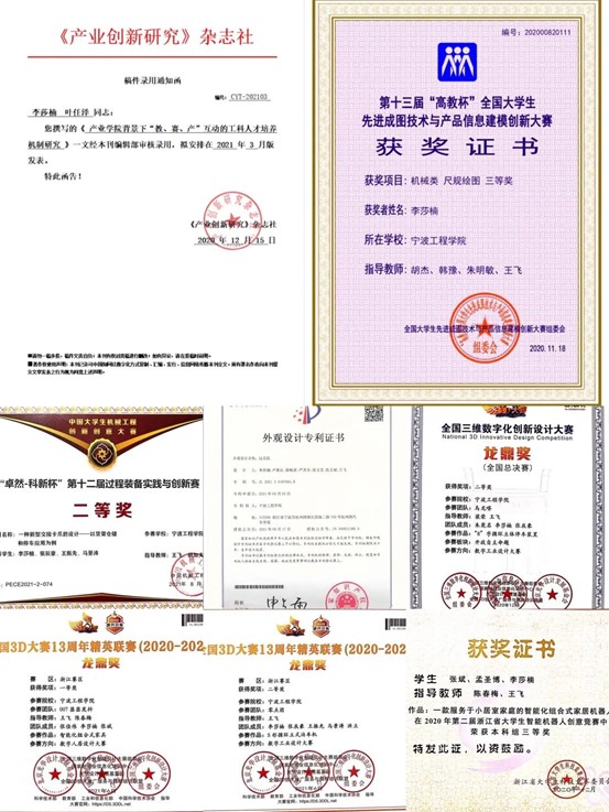 2021年 获“卓然-科新杯”第十二届过程装备实践与创新赛国家二等奖;2020年 获“全国三维数字化创新设计大赛一等奖(老员工3D/VR校园大使大赛)”;2020年 获“全国三维数字化创新设计大赛二等奖(数字工业设计大赛)”;2020年 获“全国老员工先进成图技术与产品信息建模创新大赛机械类3D打印一等奖”;2020年 获“全国老员工先进成图技术与产品信息建模创新大赛机械类尺规绘图三等奖”;2021年 获“全国3D大赛13周年精英联赛龙鼎奖省一等奖;2021年 获“全国3D大赛13周年精英联赛龙鼎奖省二等奖;2020年 获“第二届浙江省老员工智能机器人创意竞赛浙江省三等奖”;2020年 获“第13届全国3D大赛数字工业设计大赛浙江省特等奖”;2020年 获“浙江省机械设计大赛浙江省三等奖”;2020年 获3044永利集团“金点子”大赛校二等奖;2020年 老员工创新创业计划项目国家级结题;2021年 获外观设计专利一项;