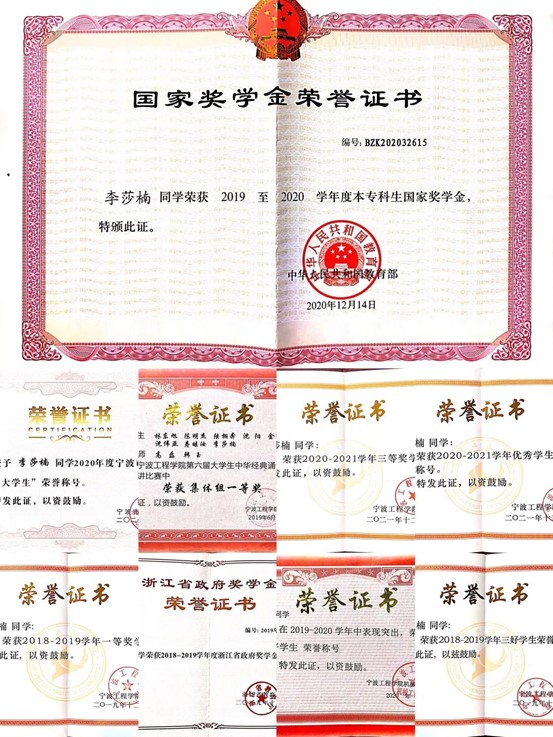 2019-2020学年“国家奖学金”、2021年度宁波市优秀员工干部、2020年度宁波市高校优秀老员工、2020-2021学年“乐歌特等奖学金”、2020-2021学年“校三等奖学金”、2020-2021学年“校优秀员工干部”、2020-2021学年“校三好员工”、2019-2020学年“校特等奖学金”、2019-2020学年“校优秀员工干部”、2019-2020学年“院三好员工”、2018-2019学年“省政府奖学金”、2018-2019学年“校一等奖学金”、2018-2019学年“校三好员工”、2018年军训“优秀学员”称号、第六届校五四演讲比赛集体组一等奖。