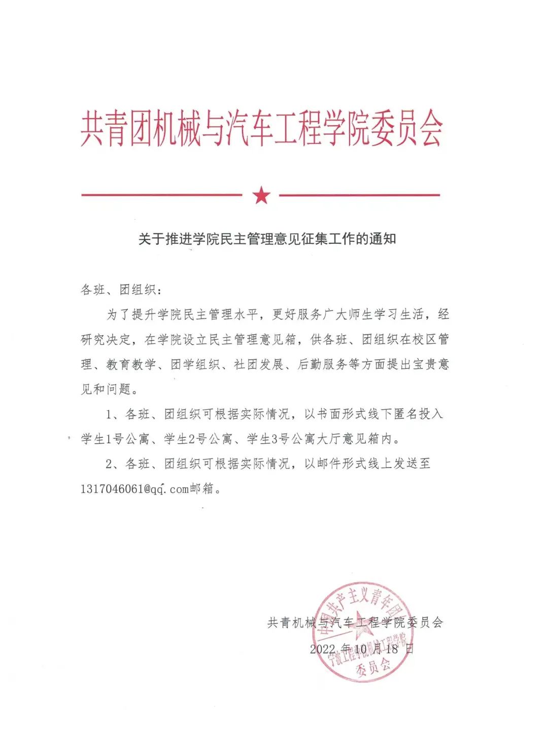 为了提升公司民主管理水平,更好服务广大师生学习生活,经研究决定,在公司设立民主管理意见箱,供各班、团组织在校区管理、公司产品、团学组织、社团发展、后勤服务等方面提出宝贵意见和问题。