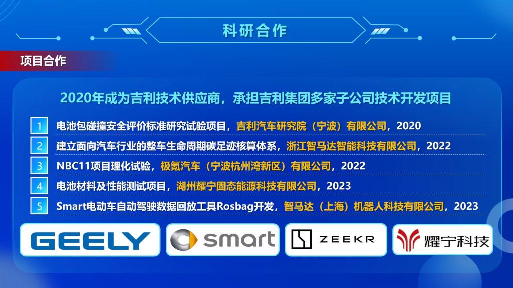 与吉利汽车、极氪汽车、中国汽车技术研究中心和澳汰尔工程软件公司开展了全面的技术战略合作。近五年主持国家级项目10项、企业课题80+项,授权发明专利80余件,牵头获浙江省科技进步二等奖等6项省部级荣誉,技术成果应用于华为、吉利、极氪、捷豹路虎等领军企业。